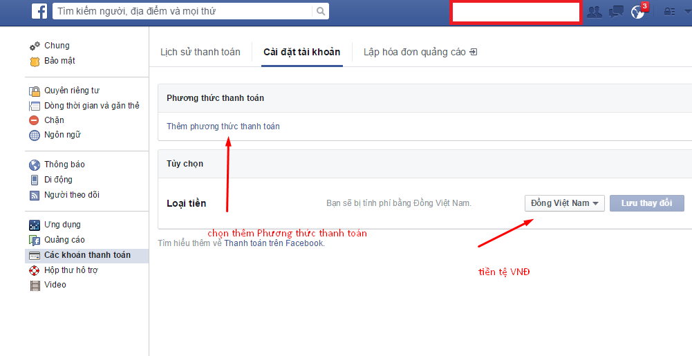 Lưu ý : Nếu không truy cập được, các bạn có thể vào trực tiếp bằng link sau :https://secure.facebook.com/settings?tab=payments&ref=settings_nav