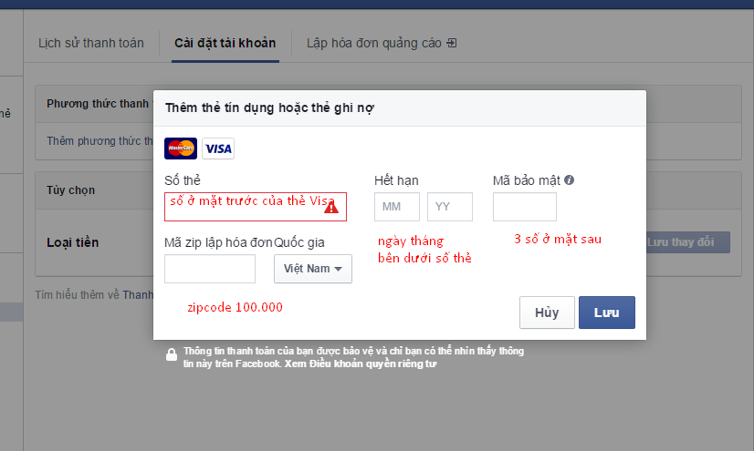 Lưu ý : Thẻ visa nên còn khoảng 25-50K trong tài khoản để facebook xác mình thẻ ( số tiền này sẽ được trả lại cho bạn sau khi xác minh thẻ xong )